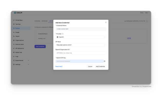 Select your LLM provider, enter your API Key and click "Add Credential"